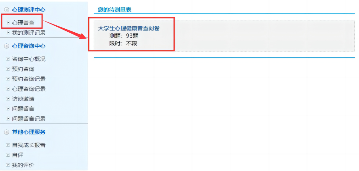 从学校官网首页,登录办事大厅,进入系统后,点击心理健康服务,接着点击左侧心理普查栏目,完成大学生心理健康普查问卷”。